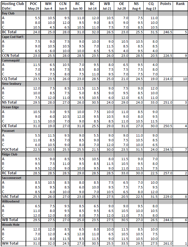 While the Ridge Club held onto 1st place for several weeks, Cummaquid got the best of us leaving us in 2nd place behind Woods Hole